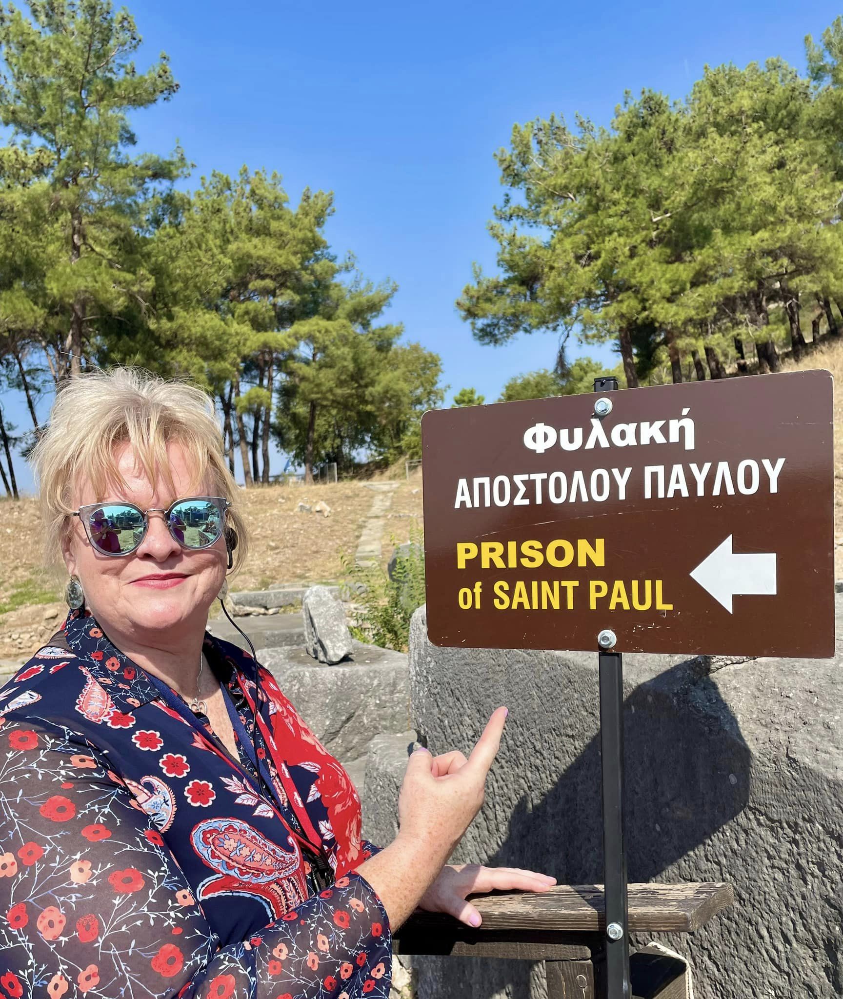 One of the places we visited on our “Footsteps of Paul” tour last month was Philippi. Our dear friend and tour host was Donna Snow, pictured below by the sign of what some believe to be the jail cell where Paul and Silas were held. Our local tour guide told us they were new discoveries by the archaeologists that led them to believe the jail may have been in another part of the town. Whether we were in the exact spot or not doesn’t matter. The events of Acts 16 happened in that town. God’s Word was shared, and by the power of the Holy Spirit, people believed. Did you know that in Greece today, 95% of the population identifies as Greek Orthodox? The vast majority of the Greek population identify themselves as the followers of Christ! And is started with Paul sharing the message of God’s love in Christ in Philippi.